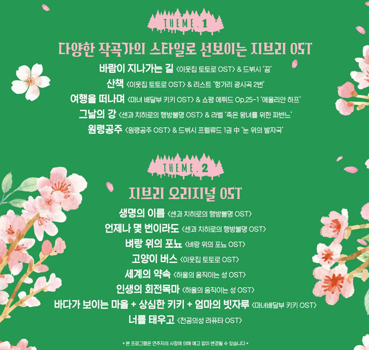 쇼팽, 리스트 등 다양한 클래식 작곡가별 스타일로 재해석한 지브리 음악부터 원곡 가수 기무라 유미의 목소리로 듣는 오리지널 지브리 OST까지, 미야자키 하야오 애니메이션을 더욱 빛나게 하는 감성적인 지브리 음악과 클래식의 만남이 기대됩니다.